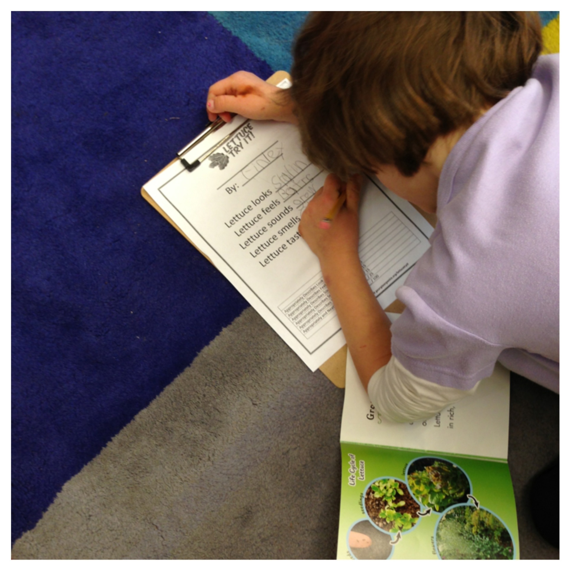 We started by reviewing what we had learned – We read “Lettuce Grows on the Ground” and gathered information from lettuce seed packets.