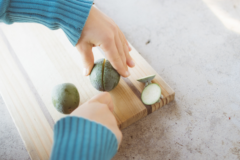 The pineapple guava was harvested and the students utilized the outdoor kitchen, simply equipped with two sinks, some cutting boards, and a jar full of cutting knives, to slice up the fruit.